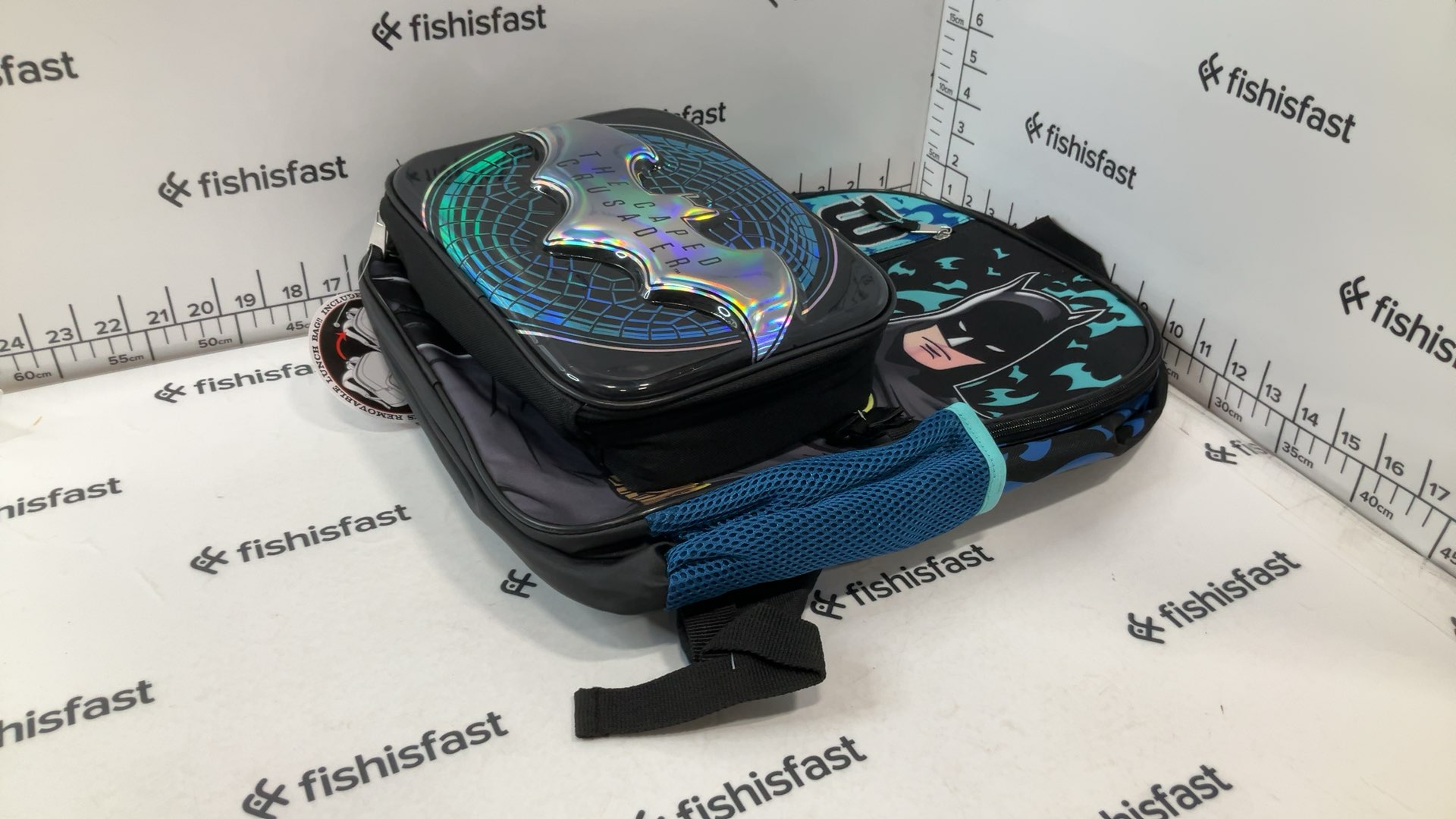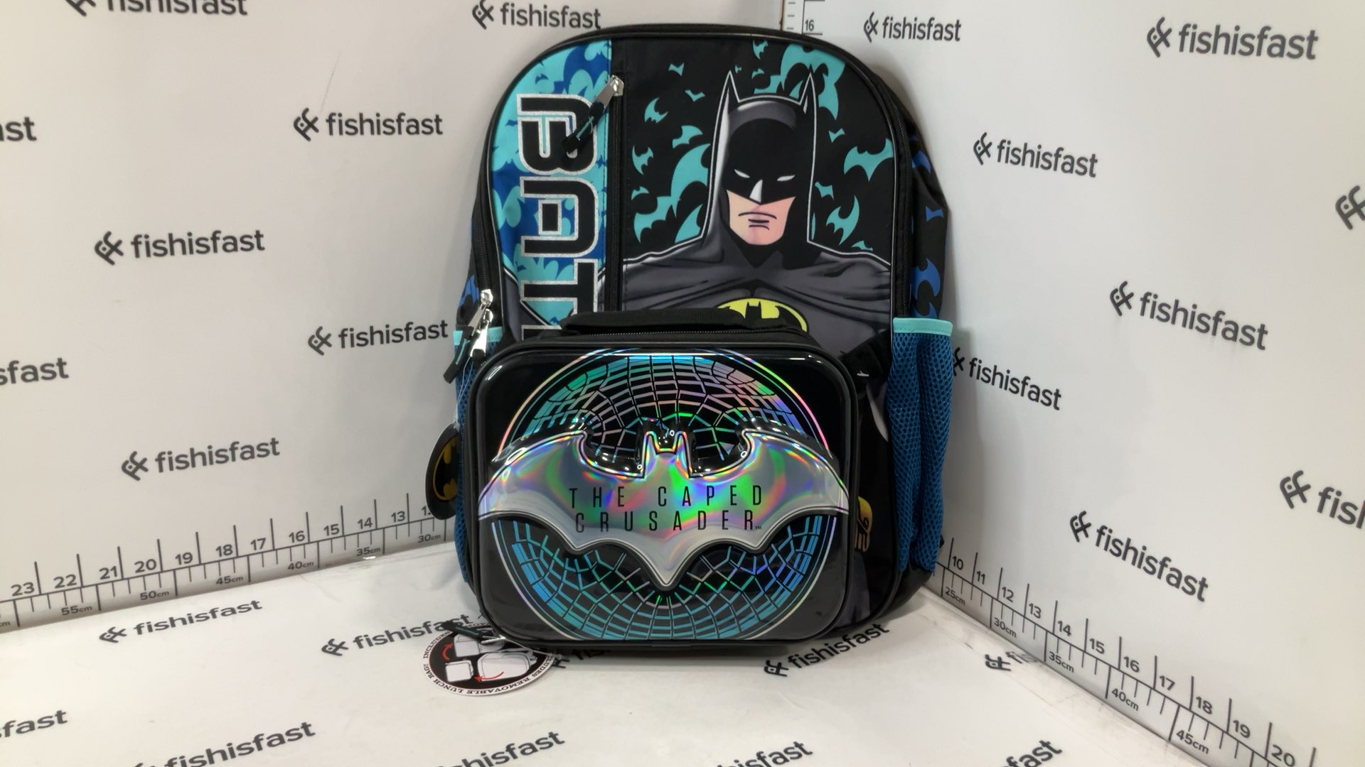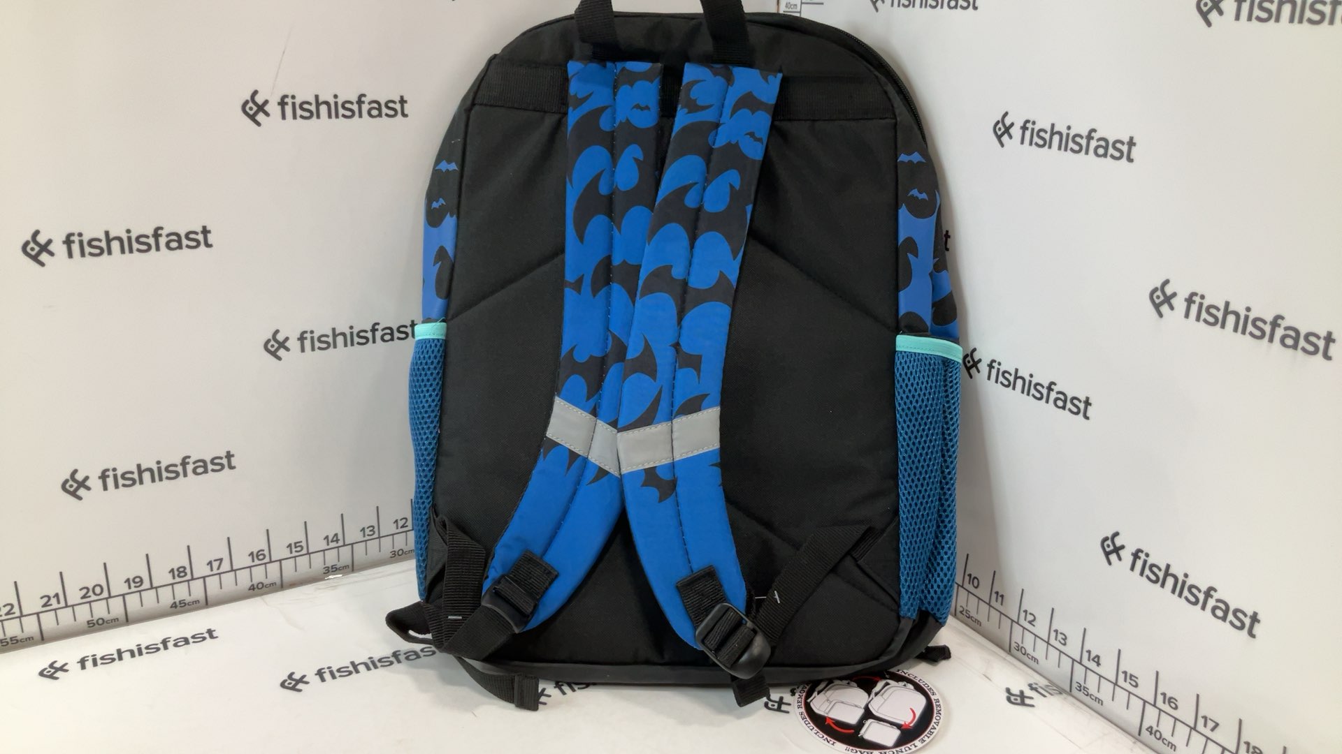 Batman Gotham City Hero 17 Backpack with Lunch. Backpack measures 17 H x 12 W x 5 D. Lunch measures 7.5 H x 9.25 W x 3 D. 2 PC set backpack with detachable lunch. Cordura body with foam mesh side pockets. Artwork is sublimation print with silver ink accents. 3D embossed plastic panel on the lunch.