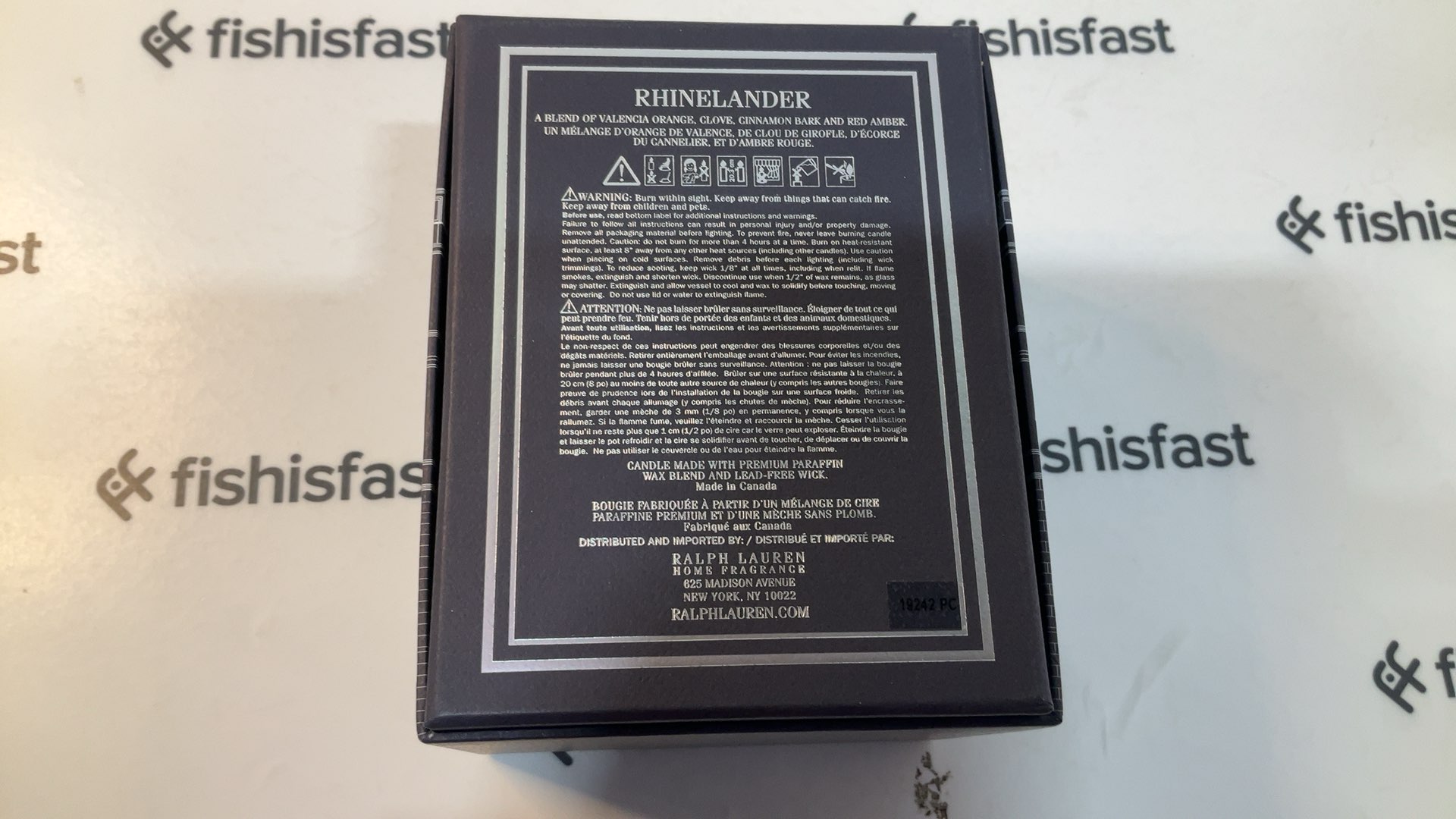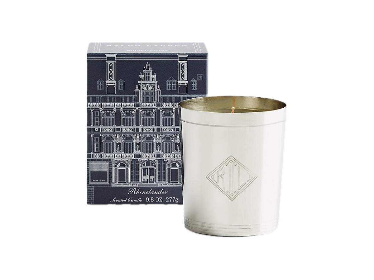 Ralph Lauren Home Rhinelander Flagship Candle. Rhinelander Flagship candle celebrates Ralph Lauren men's flagship in New York City with a fragrant blend of Valencia orange, clove, cinnamon bark, and red amber. Detailed with an iconic monogram, the elegant silver-plated brass holder is presented in our signature flagship box for easy gift-giving.